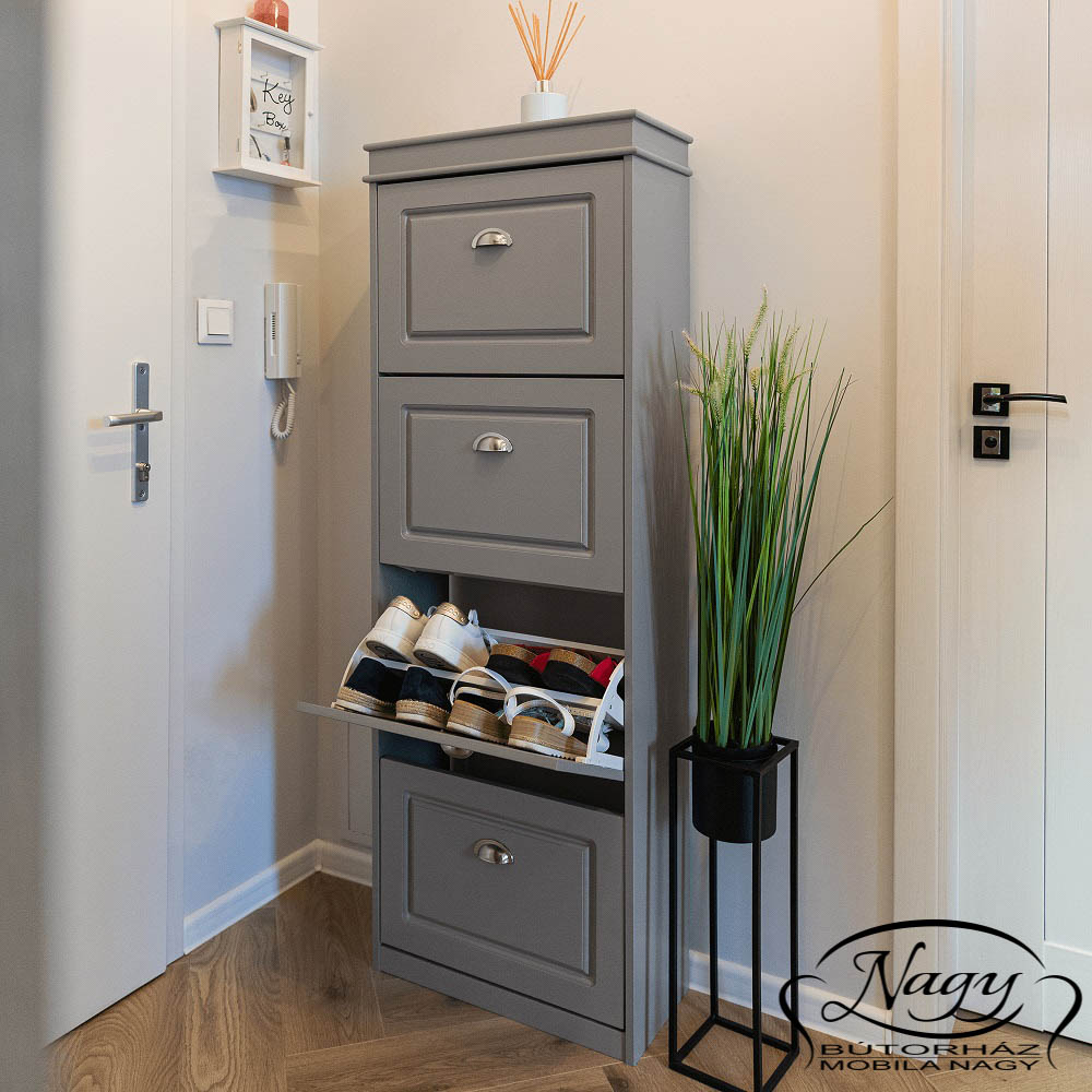 Acest pantofar urmează linii drepte, simple si poate oferi spaţiului de intrare în locuinţa un aspect modern si elegant. Finisajul gri realizeaza o atmosfera primitoare si luminoasa. Aceasta nuanţă deschisă oferă o notă caldă spaţiului în care este amplasat pantofarul.