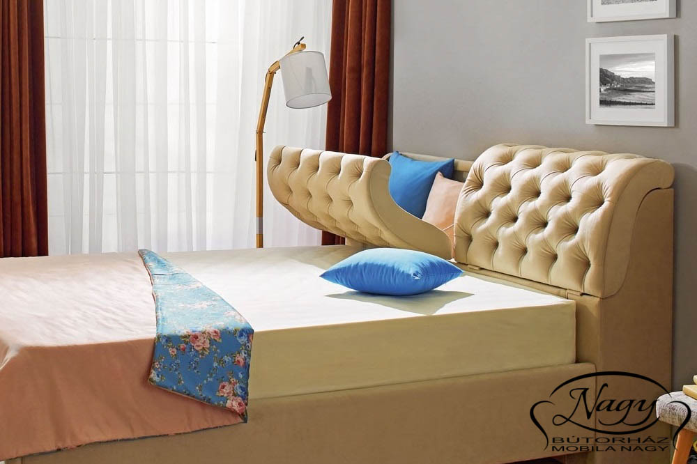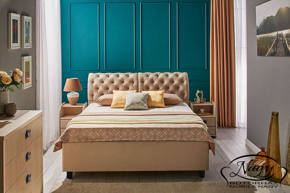 Patul Frankfurt Bej îmbină armonios materiale de înaltă calitate, tapiţat cu stofă, având un design modern, cu spătar înalt, în linii simple si cusături atent studiate.