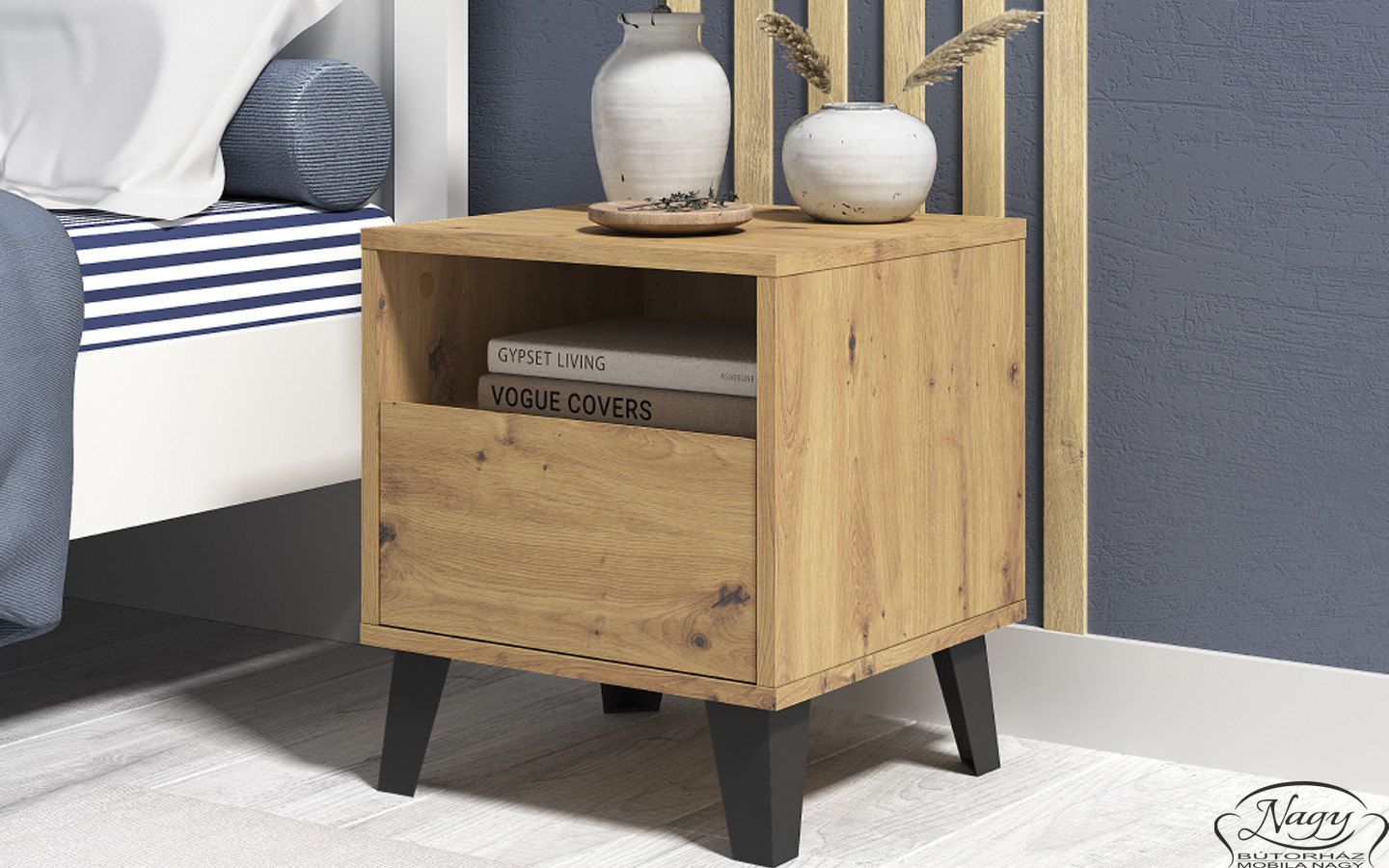 Acesta face parte integranta din aproape fiecare pat. Potrivita pentru dormitor, camera copiilor sau a studenţilor. Realizat într-un design atemporal din PAL laminat în finisaj cașmir, alb și stejar. Noptiera BOGAN NEW 1S ofera spaţiu de depozitare sub forma unui sertar i a unui compartiment de depozitare deschis. Aspectul elegant este semnat de picioarele negre.
